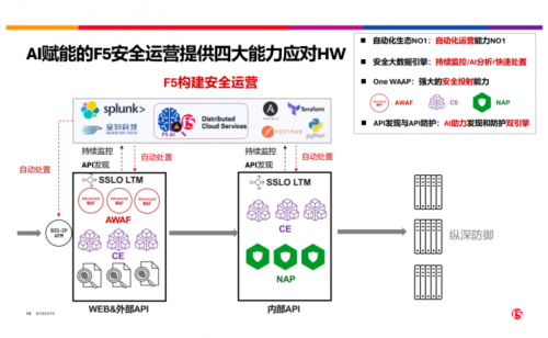 F5早在网络安全成为企业运营核心组成部分之初,便洞察到单纯依靠传统安全技术和方法已无法满足现代企业日益复杂的安全需求,提出了“安全需要运营”的理念,走在了其他网络安全公司的前面。实际上,早在15年前,F5就开始深耕AI领域的能力。今年2月份,F5宣布将AI技术普及至整体解决方案组合,帮助企业防御复杂AI威胁的同时,实现更轻松地保护和管理多云应用环境。为提升企业安全管理的效率,F5通过引入“AI 智能”分析技术,构建了自动化运营、持续监控\AI分析\快速处置、One WAAP安全投射能力以及API发现及防护四大核心能力的全方位、多层次安全防护体系,保障企业在多云环境中自如应对各种网络威胁。
